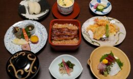 鰻ざく、おさしみ、鰻巻、柳川(小)、鰻重(1/2)、きも吸い、香の物、クリーム…