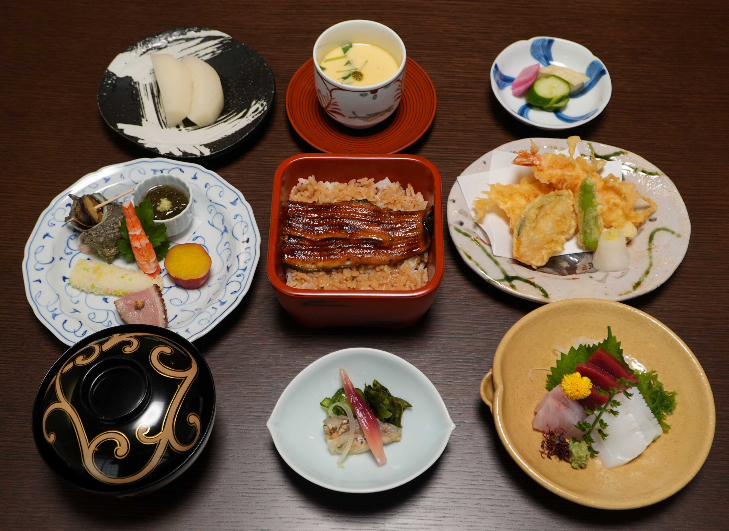 前菜、おさしみ、茶わんむし、揚物、酢の物、鰻重(1/2)、吸物、香の物、デザート…